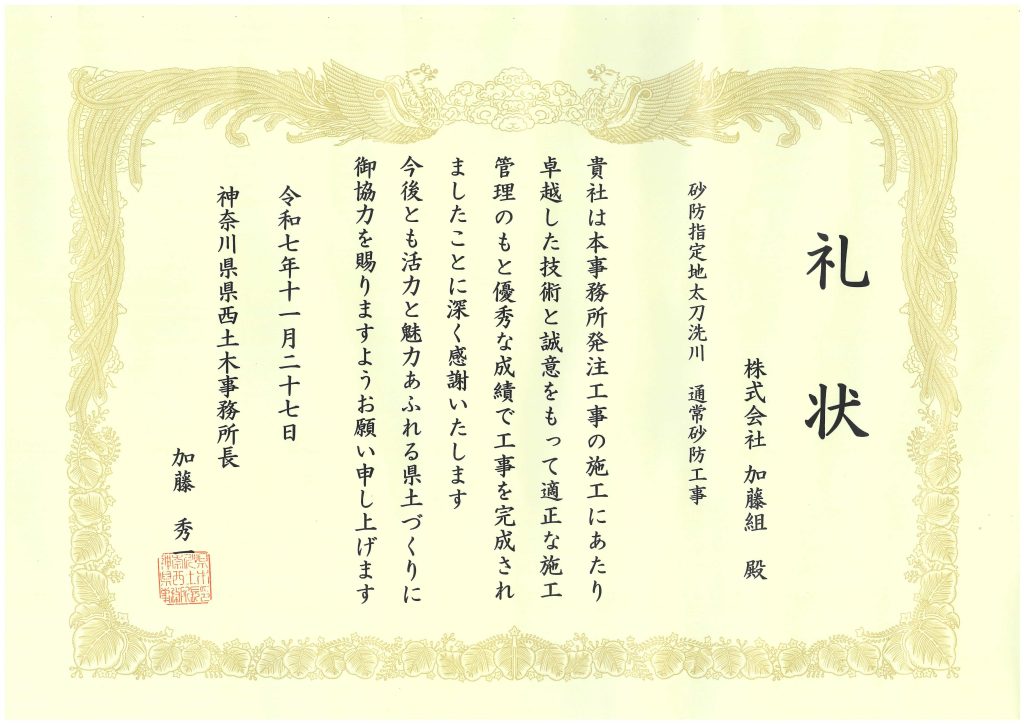 令和7年度 県西土木事務所 優良工事等所長礼状をいただきました